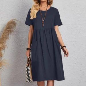 This women’s midi dress is made from soft, lightweight, and stretchy fabric , ensuring comfort. It features a sleeveless design , V-neck , and decorative buttons, with functional pockets for convenience. The dress has a flowy silhouette and a midi length, making it suitable for various occasions, including daily wear, parties, and vacations. It can be paired with sandals, heels, or boots, and layered with a jacket or cardigan for different looks. The dress is breathable and has a loose fit, making it flattering and comfortable to wear.