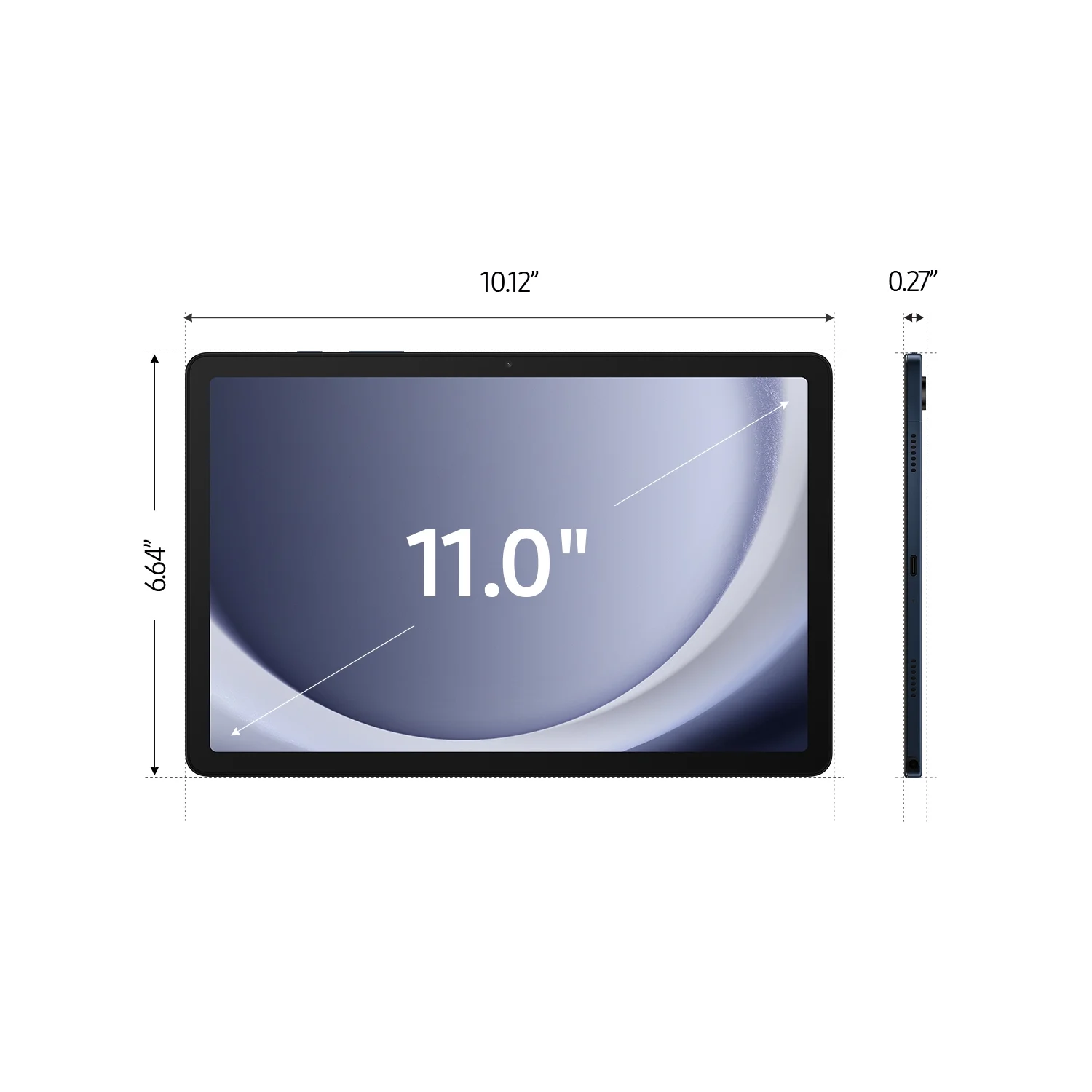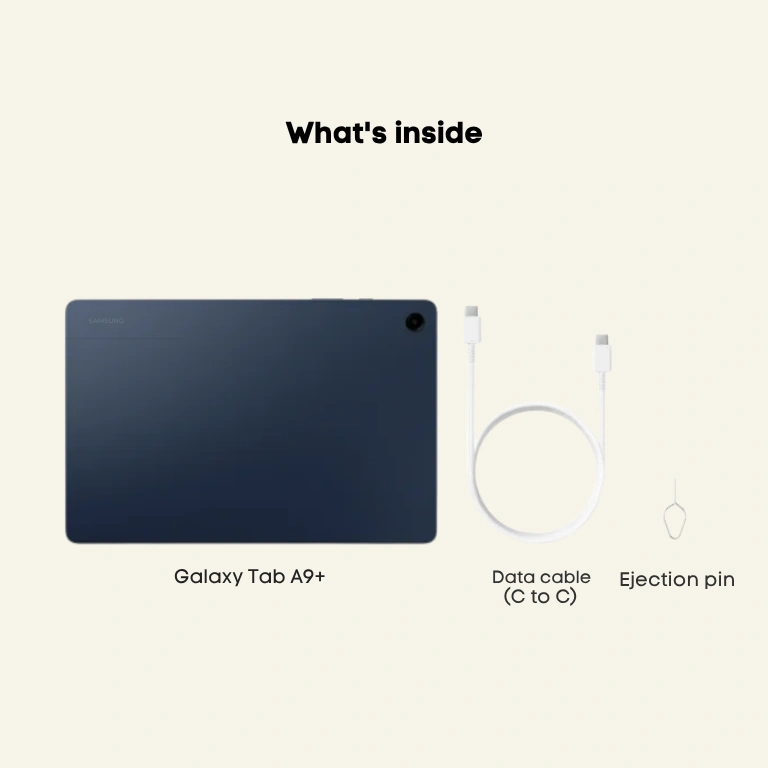 - *LEGAL: Measured diagonally, the Galaxy Tab A9+ screen size is 11.0″ in the full rectangle and 10.9″ accounting for the rounded corners. Actual viewable area is less due to the rounded corners. Samsung Kids app comes preloaded on Galaxy Tab A9+. Portion of storage / memory occupied by existing content. MicroSD card sold separately. Requires minimum 15W wall charger (sold separately). Use only a Samsung approved charger and USBC cable. To avoid injury or damage to your device, do not use incompatible, worn or damaged batteries, chargers or cables. Certain applications may not support MultiActive Windows use. Feature supported on mobile devices running One UI 2.5 or later and TV models 2018 U7400 series or upper model. Must be logged in to the same Samsung account and be on the same Wi-Fi network. TV must be registered to SmartThings app. Stay connected to your family and friends by picking up a call or returning a text from your Tab.