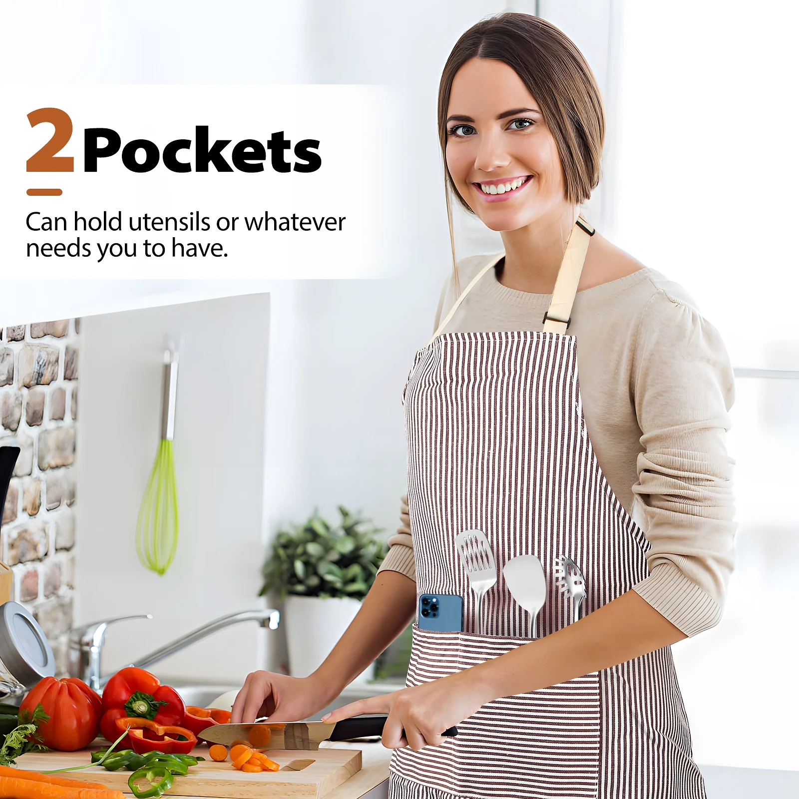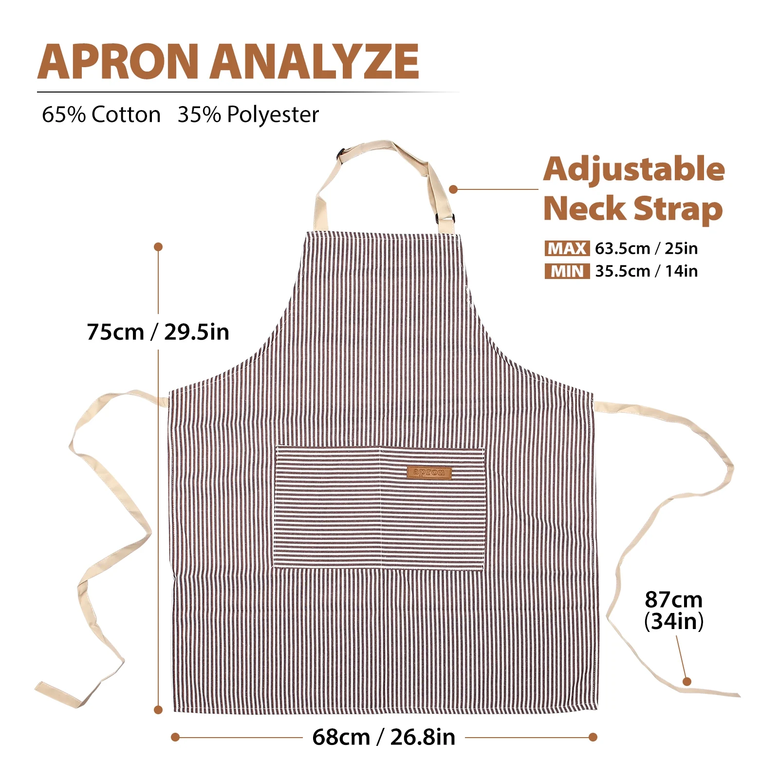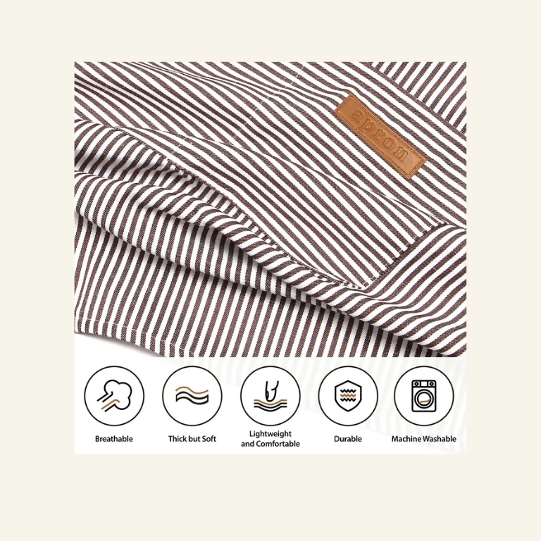 This Bundlepro Kitchen Cooking Apron is made of soft, breathable, and lightweight 35% polyester and 65% cotton material. It features adjustable long ties and an adjustable neck strap to fit most sizes. The apron has two spacious pockets to hold items like seasoning packets, meat thermometers, and recipe cards. It’s suitable for various activities, including cooking, BBQ, and DIY projects . The apron is machine-washable, fade-proof, and resistant to wrinkles . It’s a great gift option for men and women, and its brown stripe design makes it a stylish addition to any kitchen