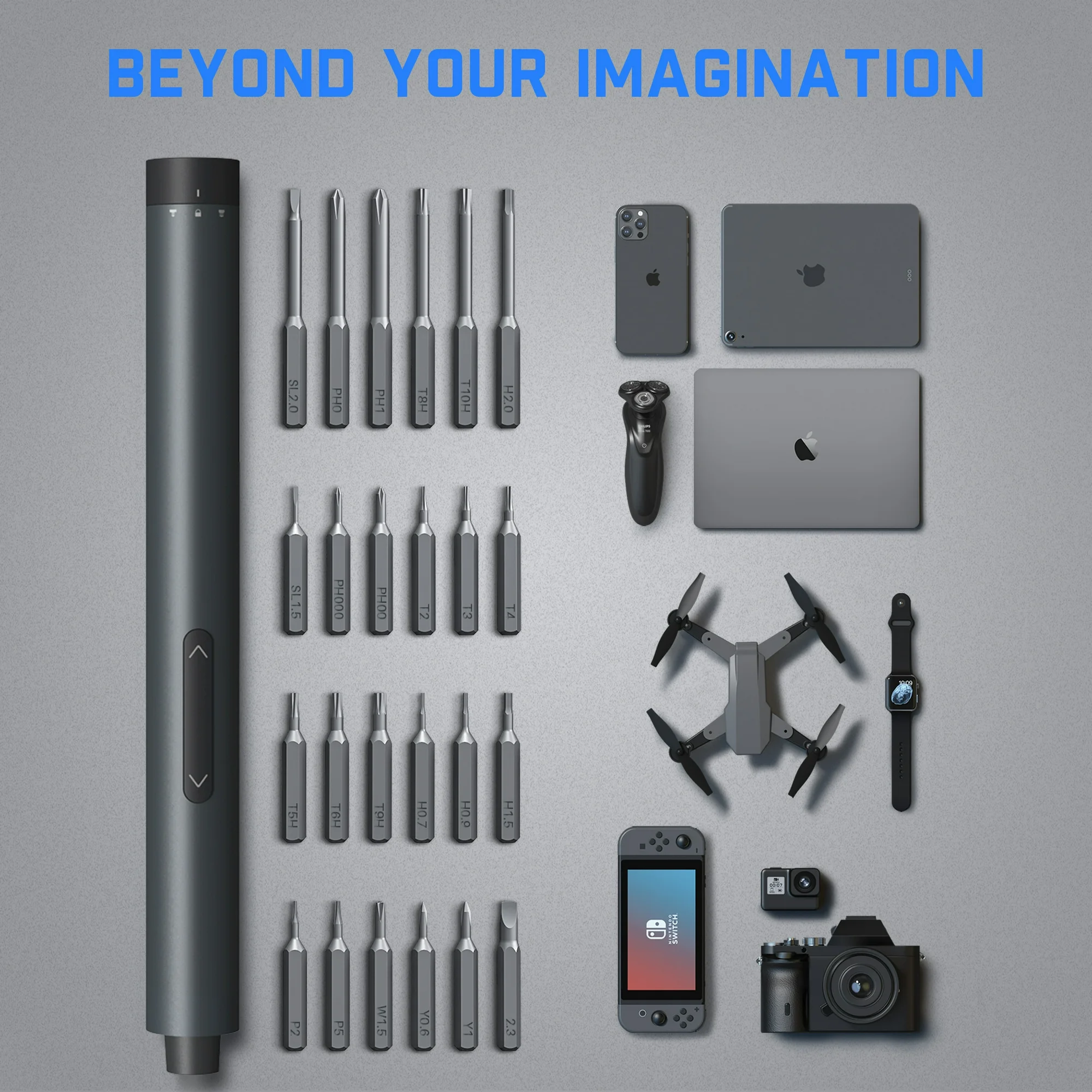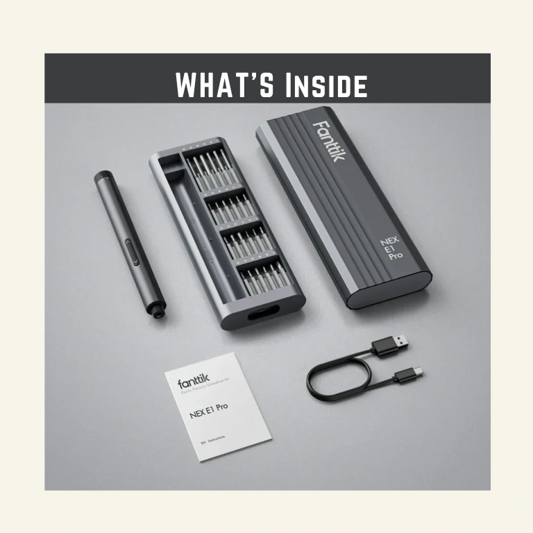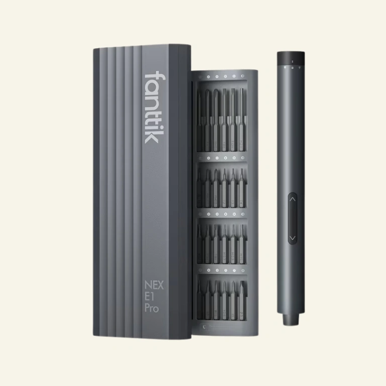 The Fanttik E1 Pro cordless electric screwdriver features 3N.m torque , 24 magnetic bits , and a 350mAh lithium-ion battery for up to 2 hours of continuous use . Made from aluminum with S2 steel bits, it has a portable design and ergonomic grip. The screwdriver includes two gear torque control and manual mode, with a speed of 180 RPM . It measures 8.74 x 3.07 x 1.14 inches and comes with a storage case, USB Type-C charging cable, and user manual. Suitable for electronics repair, including phones, laptops, watches, and precision instruments.