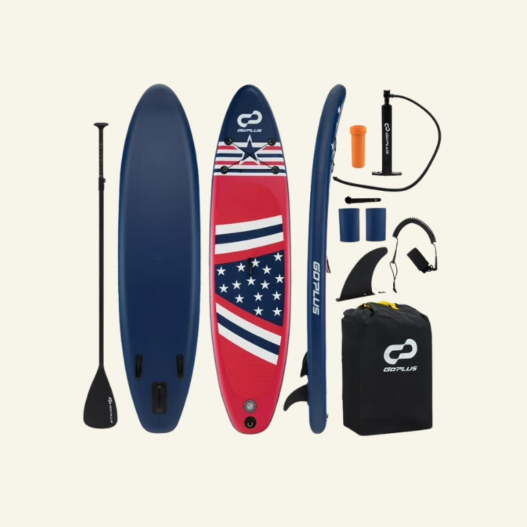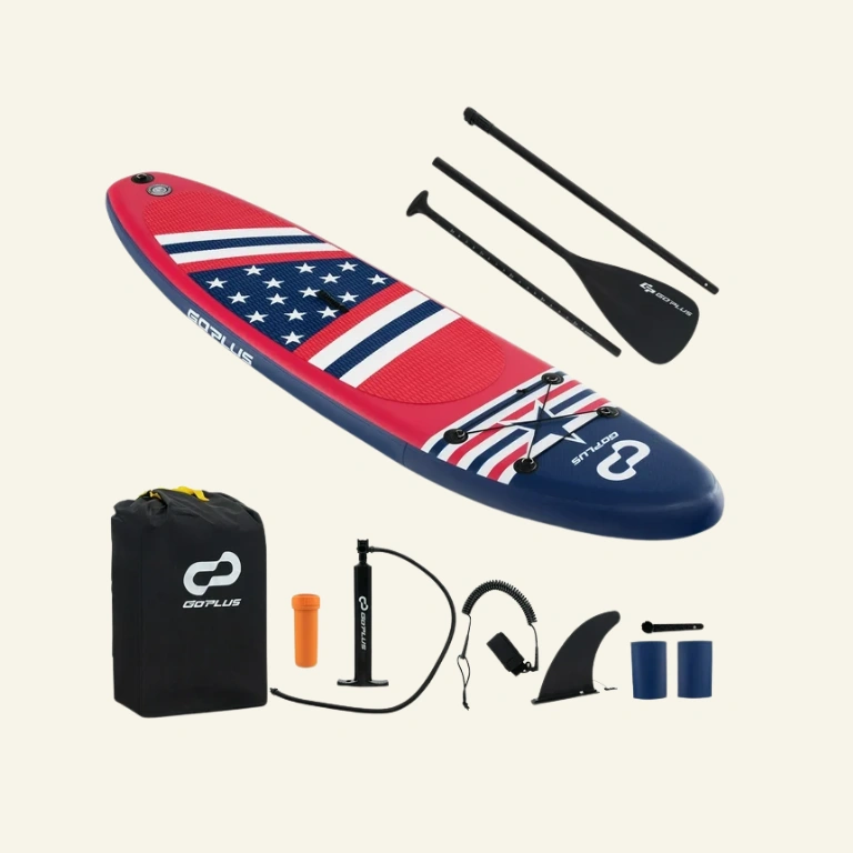 The Goplus 10′ Inflatable SUP Board is a versatile and durable paddle board suitable for all skill levels. It measures 10′ x 30″ x 6″ and features  5 D rings for securing accessories . The adjustable paddle extends from 65.5″ to 82″ for versatility.  Made from premium PVC , it is wear-resistant and tough, ensuring a long service life in various water environments. The portable and inflatable design allows for quick inflation and easy storage when not in use. The package includes a backpack, hand pump, paddle, leash, repair kit, and other accessories. It has a  maximum weight capacity of 300 lbs  and is available in red color.