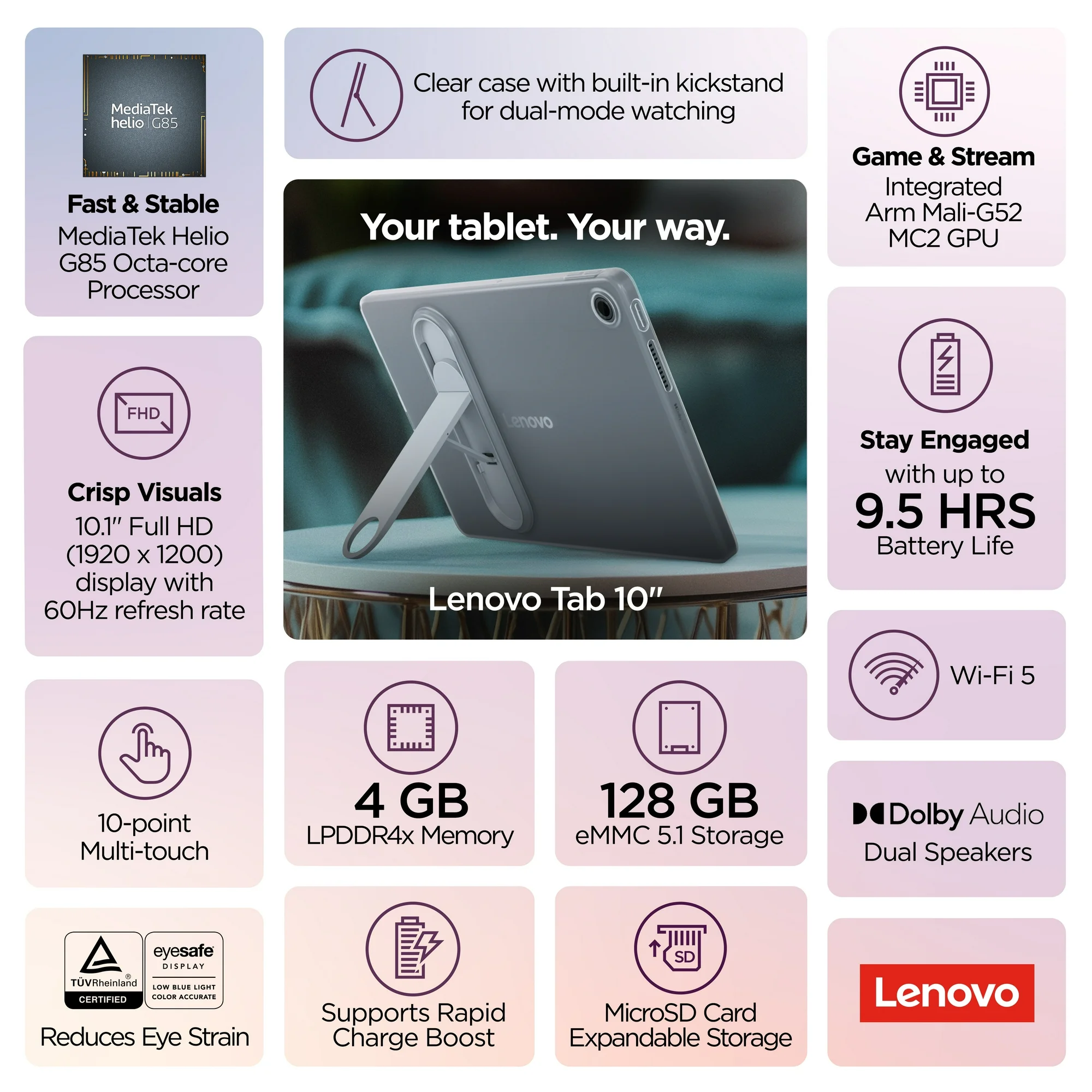 Lenovo Tab 10.1 1920 x 1200 60Hz MediaTek Helio G85 4G 128G WiFi 5 Android 14 ZAEH0148US