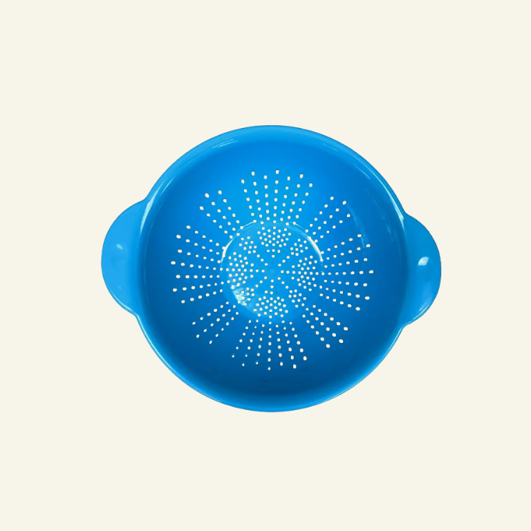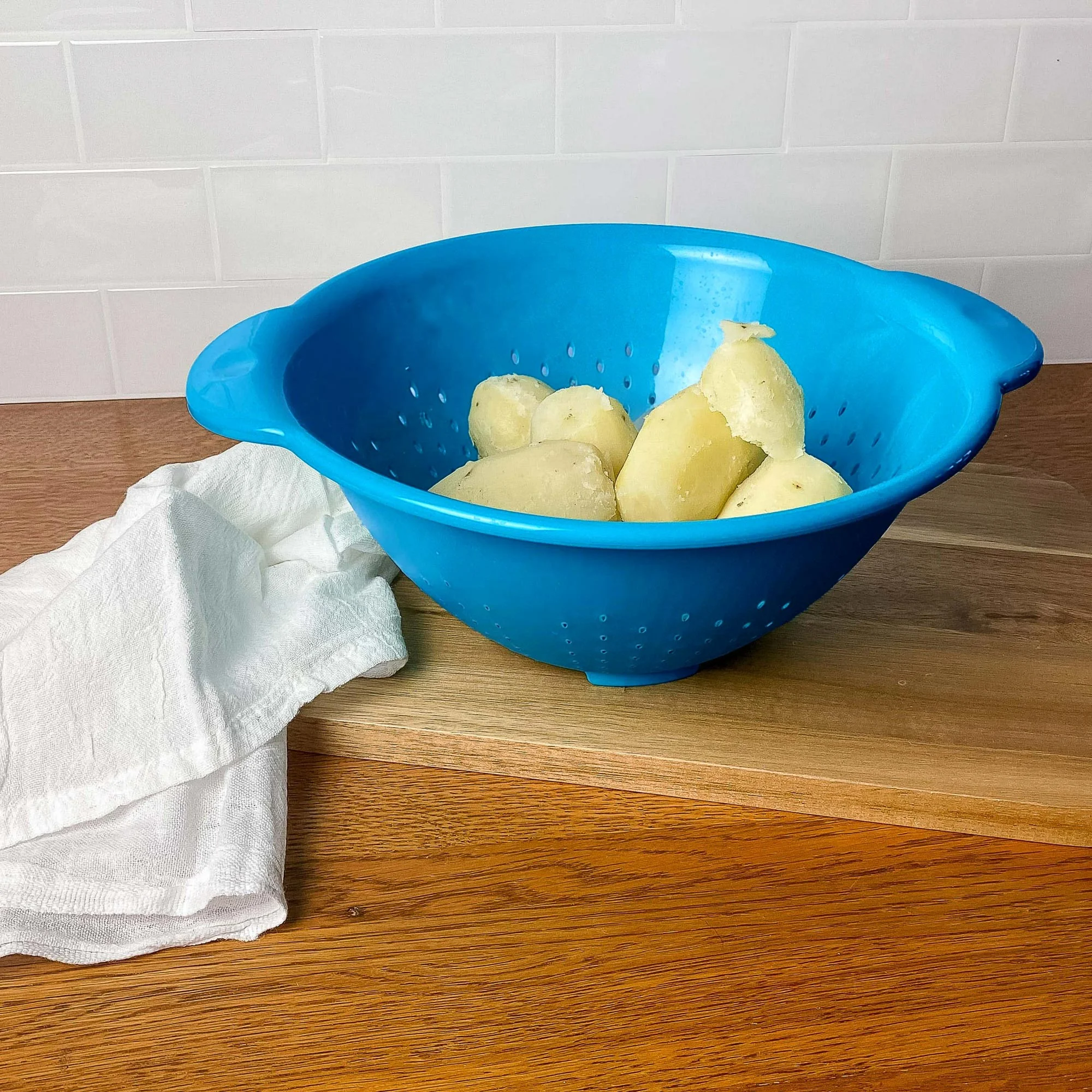 Bring some color in to your kitchen! The Mainstays 4-Quart Cool Water Blue Colander is a colorful addition to your kitchen basics. The colander features feet on the bottom. They are raised enough to keep the food from touching the bottom of the sink. The dual handles provide you with sturdy handling while keeping your hands clean. This polypropylene plastic colander is dishwasher safe for an easy clean-up process.